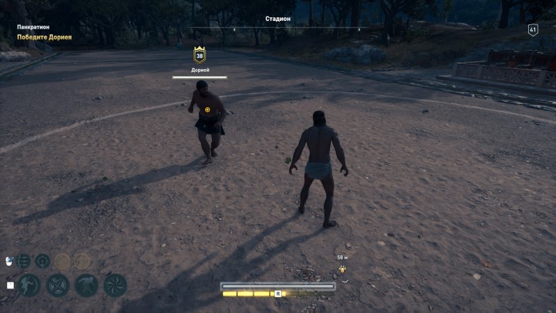 Отправляемся в городе в долину Олимпии и находим там человека, который отвечает за панкратион. Выберите момент, когда будете готовы к бою. Проведите два сражения с противниками в рукопашной и добейтесь победы. В принципе, противостояние будет достаточно простое, вам нужно просто уворачиваться от вражеских ударов и своевременно контратаковать.