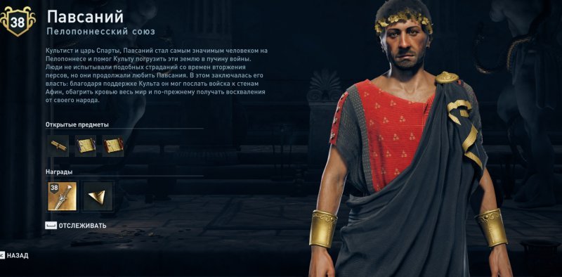 Возвращаемся в Спарту, отыскиваем там Миррин для разговора. Заходим в помещение, где находятся спартанские цари, и можете сразу обвинить Павсания в том, что он является членом культа (на самом деле, пока что данный факт не имеет особого значения). По результату главного героя выставят вон из помещения, последует непродолжительный разговор с Павсанием, и теперь мы знаем, кто является истинным врагом Спарты.